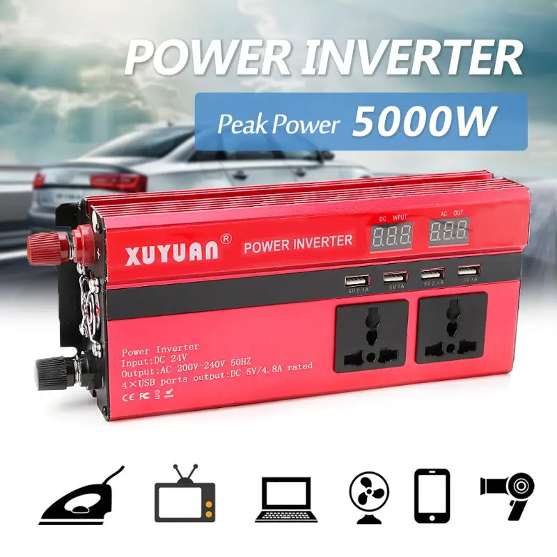 BEST QUALITY 5000W Solar Car Power Inverter LED DC12/24V to AC110/220V Sine Wave Converter 4 USB Interfaces